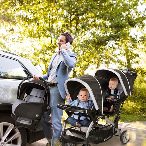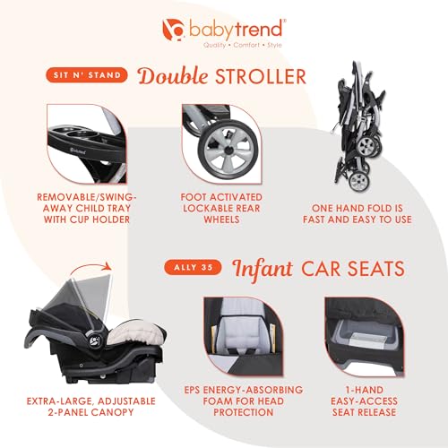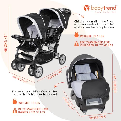 The Baby Trend Sit N’ Stand Double Stroller and 2 Car Seats bundle offers a versatile and convenient solution for families on the move. This stroller accommodates up to two Baby Trend infant car seats, effortlessly attaching them to the child’s tray for easy and secure transportation. The front seat comes with a removable 2-panel fully ratcheting canopy, providing excellent sun protection, while the rear seat features a fixed canopy with visors to shield your little ones from the sun’s rays. With a user-friendly one-hand fold mechanism, an extra-large basket to store all your essential travel items, and a parent console equipped with two cup holders and a covered compartment, this bundle ensures you have everything you need for a hassle-free and enjoyable day out with your family. The Baby Trend Sit N’ Stand Double Stroller and 2 Car Seats bundle is a versatile and practical choice for parents seeking a seamless and comfortable travel solution for their children. Its multiple seating options, sun protection features, ample storage space, and convenient parent console simplify family outings, allowing you to focus on creating wonderful memories with your loved ones. For little ones weighing 35 pounds and 32 inches long, the infant car seats feature a 5-point safety harness with a simple 1-hand adjustment and push-button release, 4-position height adjustment, and a height-adjustable seat back for a secure and snug fit. Ensure your child’s ultimate safety while traveling and keep them safe and sound with the Double Baby Stroller with 2 Single Car Seats from Baby Trend.