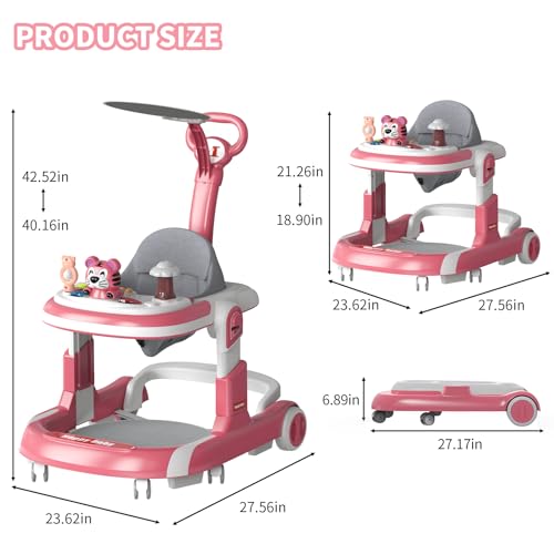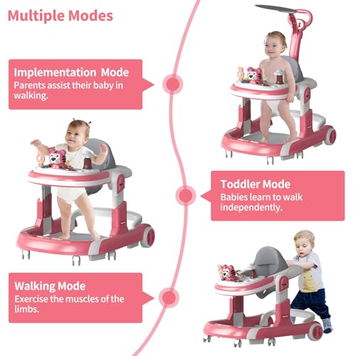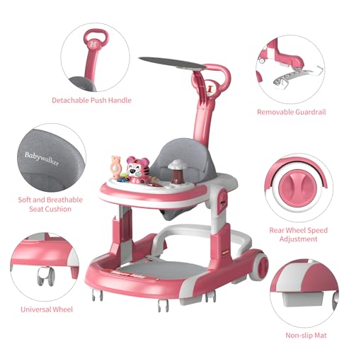 Baby Walker, Baby Walkers,5and 1 Baby Walker with Wheels, Baby Walkers and Activity Center for Boys Girls Foldable Infant Toddler Walker with Foot Pads, Baby Walkers for Babies 6-18 Months (Pink)