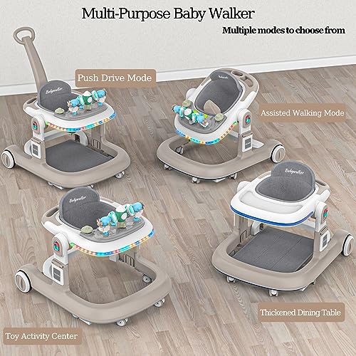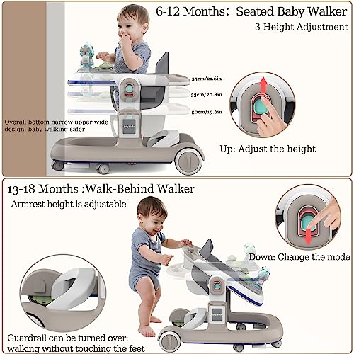 ♔【WEAR-RESISTANT SILENT WHEEL】The baby walker with wheels has four 360-degree rotating universal wheels, and two large locking tail wheels, two tail wheels can adjust the speed of the baby walker for boys, better to help the baby control the speed of movement. There is a brake device on both sides of the Walkers for babies 6-12 months, which can prevent the baby from rollover caused by obstacles and give the baby the greatest safety guard.