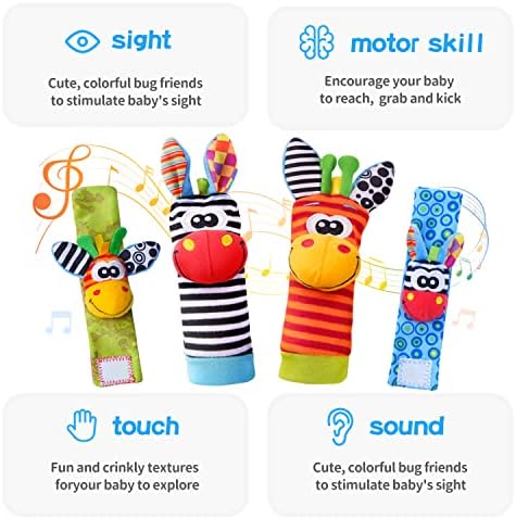 Cute Design – All wrist rattles and foot finder socks have bells inside, the wrists rattles attach with simple velcro, easy to put on and off.