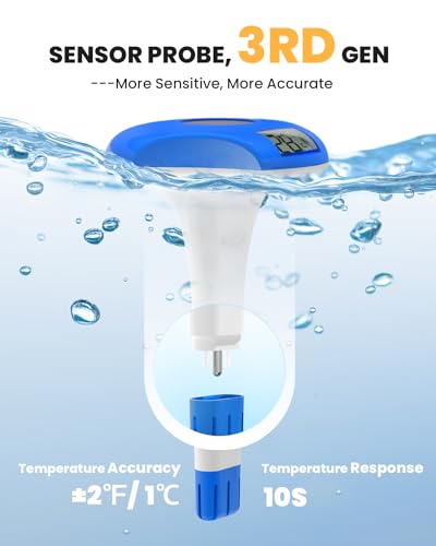 🍉SENSOR PROBE, 3RD GEN: Equipped with a high-precision sensor probe, our floating pool thermometer can update temperature data every 10 seconds. This results in more sensitive and accurate temperature readings (in ℉/℃) with a temperature accuracy of ±1.8℉/1℃.