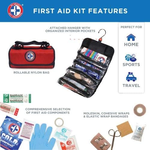 Be Smart Get Prepared 73-Piece Coach’s and Team Sports First Aid Kit in Roll up Bag: Clean, Treat, Protect Cuts, Scrapes. Home, Office, Car, School, Travel, Hunting, Outdoor, Camping, FSA HSA