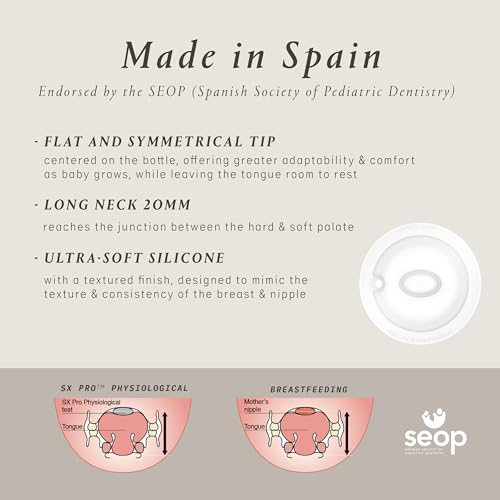 100% silicone SX Pro Physiological nipple with anti-colic valve is designed to help the tongue remain in the same natural position as when baby is breast-feeding, aiding in correct positioning of the mouth, tongue & jaw.