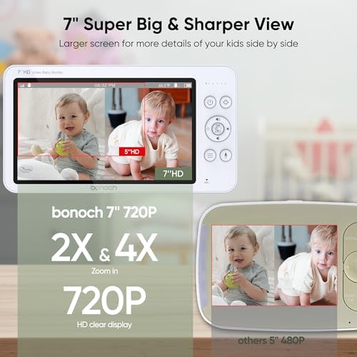 bonoch Baby Monitor with 2 Cameras, 7″ 720P HD Split Screen Video Baby Monitor No WiFi, Baby Monitor with Camera and Audio, 6000mAh, VOX Mode, 2 Way Audio, Sound Detect, Remote PTZ, Auto Night Vision