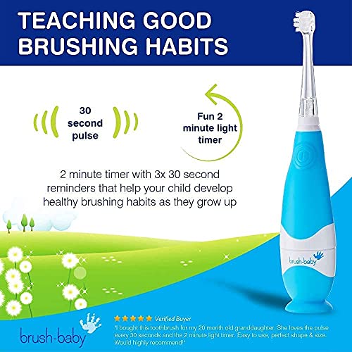 brush-baby BabySonic Infant and Toddler Electric Toothbrush for Ages 0-3 Years – Smart LED Timer and Gentle Vibration Provide a Fun Brushing Experience – Includes 2 Sensitive Brush Heads (Blue)