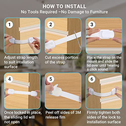 Quick Easy to Install Child Proof Drawer Locks with No Tool : baby cabinet safety locks doesn’t require screws. Simply ensure the surface is clean, dry, & free of oils. Then, peel cover off the adhesive & apply! This means no holes in the cabinets, and extra -easy installation! With our product, installing cabinet locks for child safety is a hassle-free process !