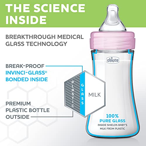 Chicco Duo 9oz. Hybrid Baby Bottle with Invinci-Glass Inside/Plastic Outside 2-Pack with Slow Flow Anti-Colic Nipple – Pink