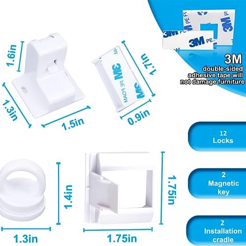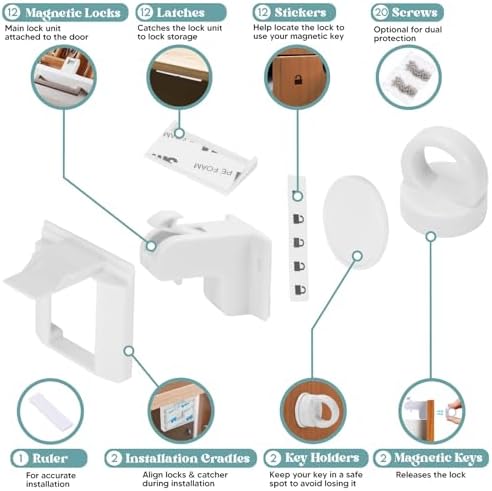 âś…Long-lasting and secure: ONAAME’s 3M adhesive magnetic baby locks for cabinets and drawers offer safety with a 25KG/55lbs force resistance. Our set includes 12 locks, 2 keys, and more. Get your baby cabinet safety latches now!”