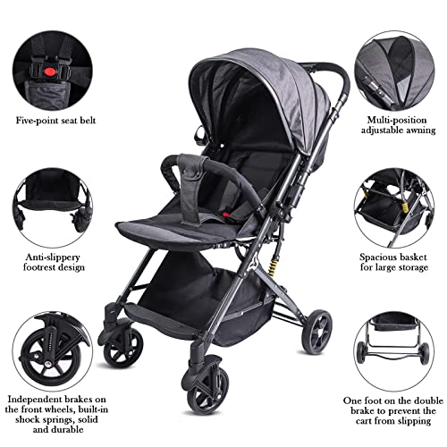 Compact Infant Stroller Baby Strollers, Reversible Seat, Folding Lightweight Travel Stroller with Adjustable Backrest Canopy Cup Holder Storage Basket Double-Sided Cotton Pad