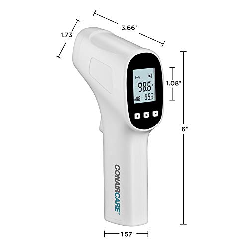 Accurate temperature measurement is essential for the health and well being of your family. Fda cleared for home and professional use, this clinical electronic thermometer makes it safe and easy to measure and track temperatures, so you can gain peace of mind. Designed with Infrared technology to provide precise temperature readings in Fahrenheit or Celsius, this home and office essential operates without contact. Just aim 1 – 2 inches away from the forehead and pull the trigger once to turn the unit on, and again to measure temperature, which appears on a large LCD display. The illuminated digital readouts are clearly visible, even in the dark. Customizable fever alert technology enables you to set alert thresholds for children and adults, and a memory function stores up to 32 readings to track progress. A silent mode option allows you to use the thermometer without disturbing a person’s sleep. Precise, safe, and fast, with a measurement range of 89.6F -109.4F (32C – 43C), the conaircare infrared thermometer is a must for today’s households and office Includes 2 AA batteries.