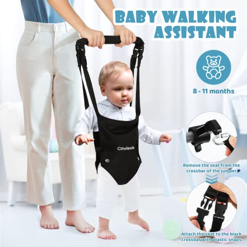 Baby Walking Harness Function: The baby harness can be removed from the jumper by releasing the carabiners and connected with a black bar through the plastic snaps. You can hold onto the harness and help your little one “walk around”.