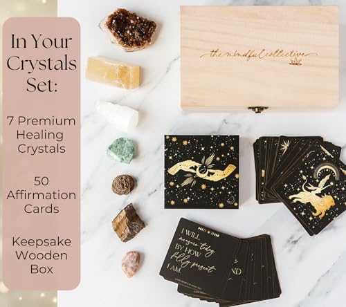 Crystals and Healing Stones and 50 Daily Affirmations Cards – Meditation Healing Crystals and Stones Crystal Set, Spiritual Gifts for Women. Authentic Crystal Witch Yoga Gifts, Witchcraft Supplies