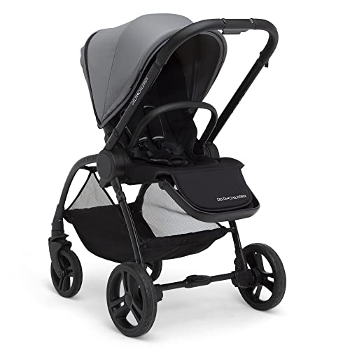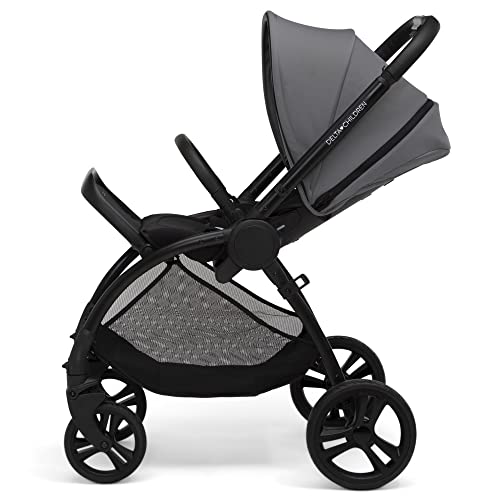 Delta Children Revolve Reversible Stroller – Leather Handlebar; One Hand Easy Fold; Lightweight Shock-Absorbing Frame; Reclining Seat and Adjustable Footrest, Grey
