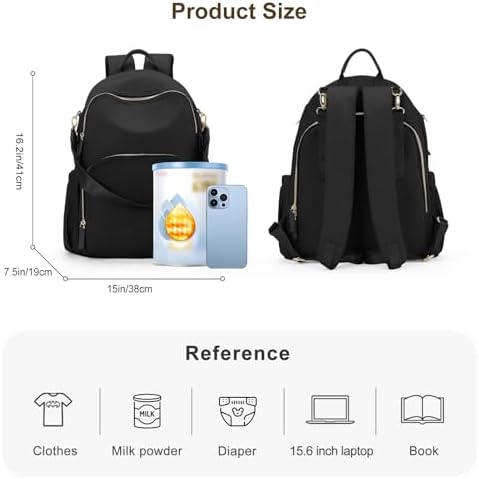 [DURABLE BACKPACK] This is a lightweight diaper backpack (measures 15 “L x 7.5 “W x 16.2 “H) made of durable polyester that is easy to clean, chemical-residue free, and gentle on baby’s and mom’s skin, and comes with extra stroller hooks, pushing the stroller with both hands is not a problem.