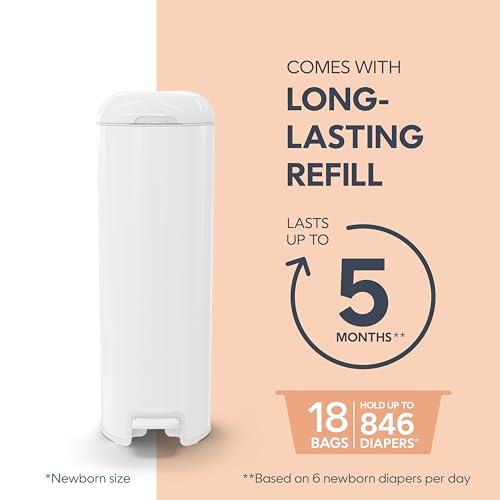Long lasting refill – pail comes with Easy Roll refill that holds up to 846 newborn diapers and lasts up to 5 months.