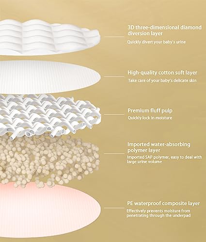 ULTRA ABSORBENT – Compared with other products of the same size , Our product one Pad weight is up to 1.4 oz, the absorbent layer and soft surface layer are thicker, softer, and absorb more liquid. Supper absorbent layers keep moisture away from baby’s skin,Quickly absorbs liquid without any mess.