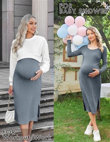 Ekouaer Maternity Dress Rib Knit Long Sleeve Side Slit Bodycon Dresses Pregnancy Baby Shower Clothes S-XXL