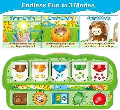 New Upgrade Game Modes: Not just Pop up! Our learning toys for 1 year old boy/ girl include 3 play modes. 1. Music Mode: When the animal pops up, it will play the relevant animal sound or some fun music. 2. Game Mode: Follow the shining light, when the light stops, let the right animal pop up and some delightful music will be played as a reward. 3. Quiet Mode: the animal will pop up even with no batteries. Best 1-year-old toys/infant toys 6-12 months to exercise hand-eye coordination.