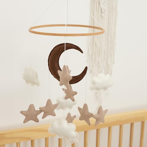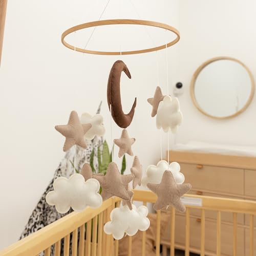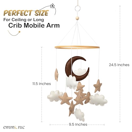 EMMNNIC Baby Mobile for Crib – Modern Boho Baby Mobile – Felt Nursery Mobile Gender Neutral – Brown Stars, White Clouds and Moon