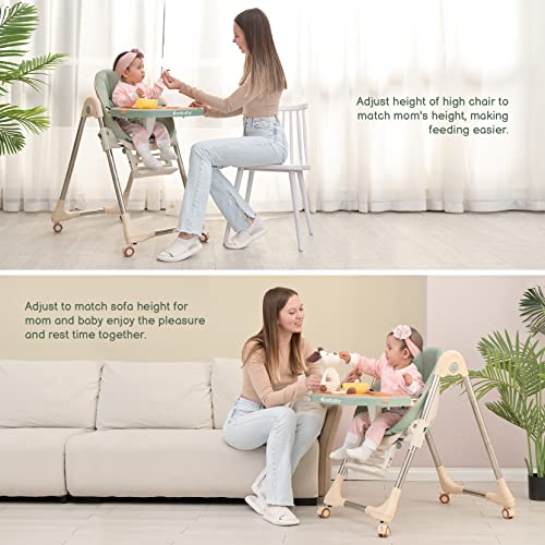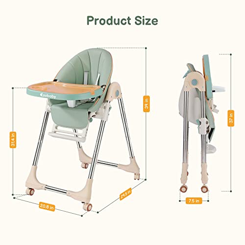 Ezebaby Baby High Chair, Portable High Chair with Adjustable Heigh and Recline, Foldable High Chair for Babies and Toddler with 4 Wheels, High Chair for Toddlers with Removable Tray-(Green)