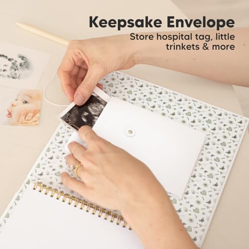 Keepsake Envelope – Our baby journal memory book for new parents features a 5.7″ x 5.7″ envelope with a secure string closure to ensure everything is kept safe. Perfect for items like locks of hair, hospital bands, heirloom jewelry, and more!