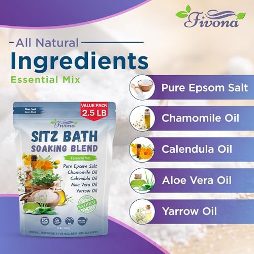 FIVONA 2 in 1 Sitz Bath Soak Kit for Hemorrhoids and Postpartum Care – Soaking Blend with Epsom Salt and Essential Oils Value Pack 40 oz with Over The Toilet Seat – Fast Irritation Relief at Home