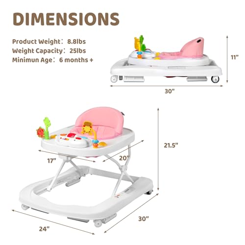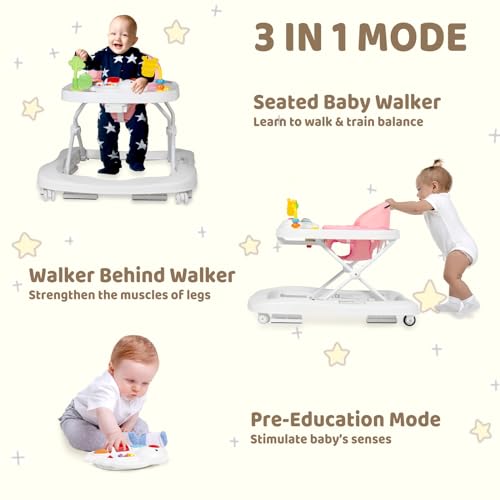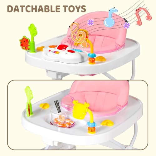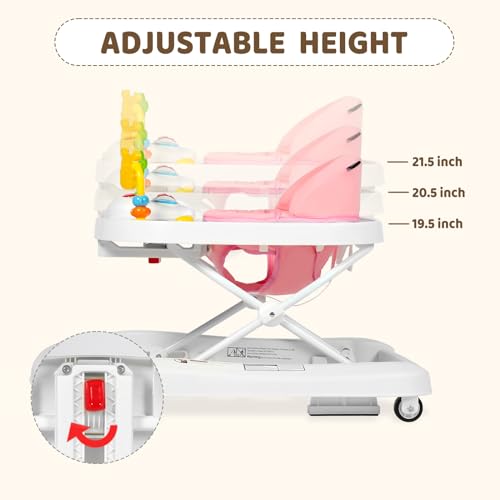 Foldable Baby Walker, 3 in 1 Baby Activity Center for Boys Girls, Toddler Walker w/Adjustable Height Speed, Learning-Seated & Walk-Behind, Infant Walker for 6-12 Months, Music Toys, Pink