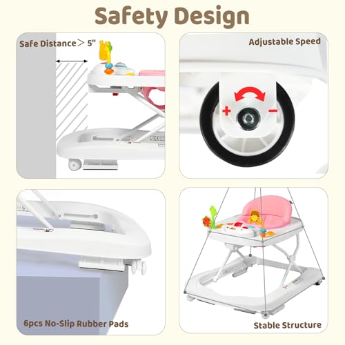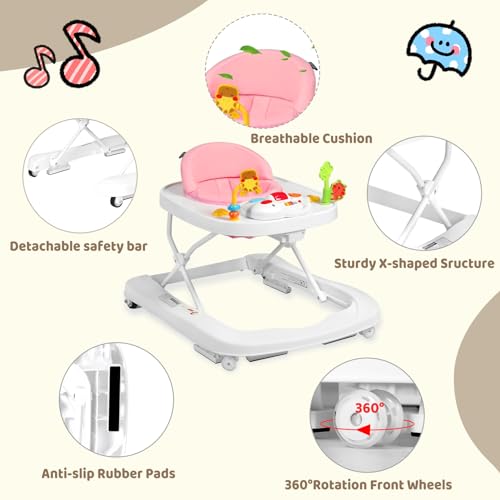 TODEFULL Foldable Baby Walker, 3 in 1 Baby Activity Center for Boys Girls, Toddler Walker w/Adjustable Height Speed, Learning-Seated & Walk-Behind, Infant Walker for 6-12 Months, Music Toys, Pink