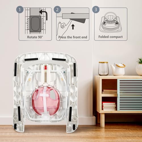 ๐ถ๐ป[Foldable Design Save Space]: Our portable walker for babies have folding support arms, which is easier to transport or store when not in use. Rotate the red button half a turn and make sure it aligns with the gap, then press the front end of the red button to easily fold. You can slide it under the bed or sofa for storage, and even if place the baby activity walker against the wall, it will not take up too much space.
