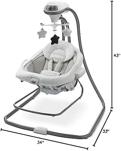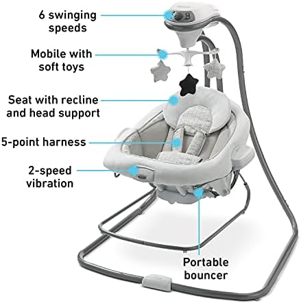 The Graco® DuetConnect® LX Swing and Bouncer features a swing seat that doubles as a portable bouncer with carry handles, giving you the flexibility to move around the house while keeping baby cozy and close by. With added features including 2-speed vibration, 6 swinging speeds, classical songs, and soothing sounds, the Graco DuetConnect® LX Swing and Bouncer has all the options baby will love.