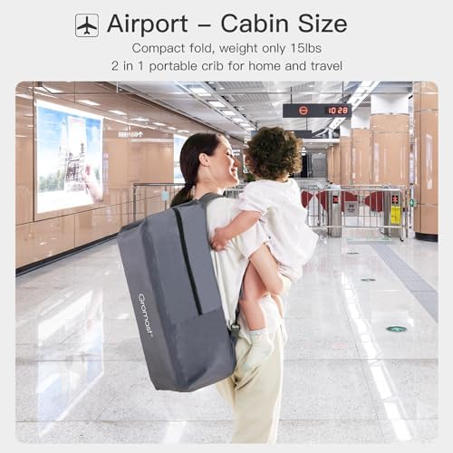Gromast Travel Crib for Toddler, 2 in 1 Portable Crib for Baby Travel, Lightweight Playpen Foldable Playard with Soft Mattress, Easy to Carry Baby Travel Bed for Outdoor,Indoor (Grey)