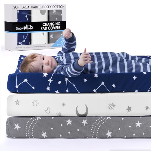 GROW WILD Changing Pad Cover 3 Pack | Soft & Stretchy Jersey Cotton | Baby Changing Table Pad Cover | Diaper Changing Pad Covers for Girls or Boys | Wipeable Sheets | Grey White Navy Blue Stars Moons