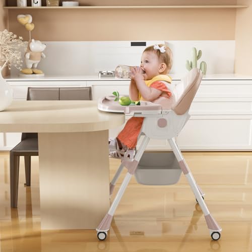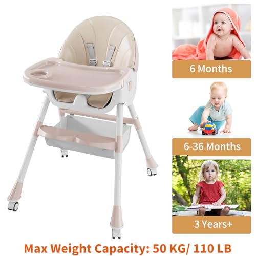 High Chairs for Babies and Toddlers, Baby High Chair with Adjustable Backrest/Dinner Plate, Foldable High Chair with 4 Wheels, Toddler High Chair with Double Removable Tray, Bearing 50KG (Off White)