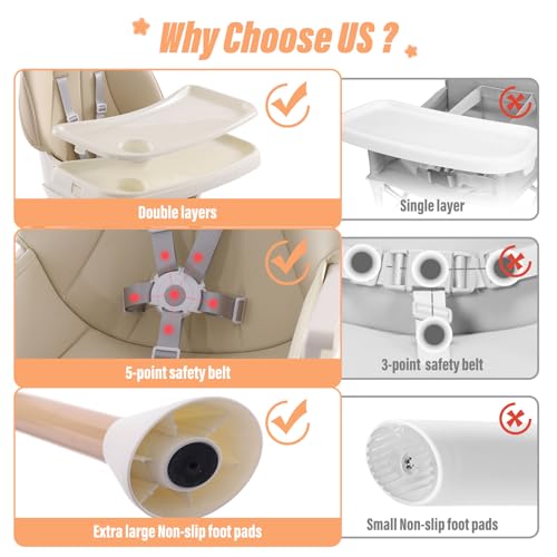 💪【100% Safety Highchair】This safety baby high chair adopts a sturdy pyramid structure and is reinforced with a specially designed support frame in the middle, making it more stable and safe than regular highchairs. A five-point harness, anti-slip baffle, and extra-large anti-slip foot pads keep our baby safe from sliding or toppling.