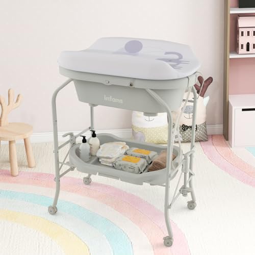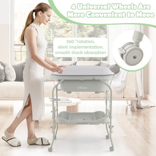 INFANS 2 in 1 Baby Changing Table with Bath Tub Unit, Folding Diaper Dresser Station with Wheels Waterproof Pad Storage Rack, Portable Nursery Organizer Stand for Newborn Infant (Light Grey)