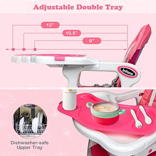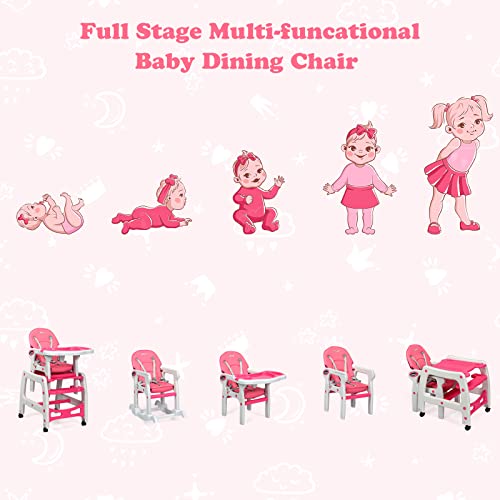 INFANS 5 in 1 Baby High Chair, Convertible Toddler Table Chair Set, Rocking Chair, Multi-Function Seat with Lockable Universal Wheels, Adjustable Seat Back, Removable Trays (Pink)