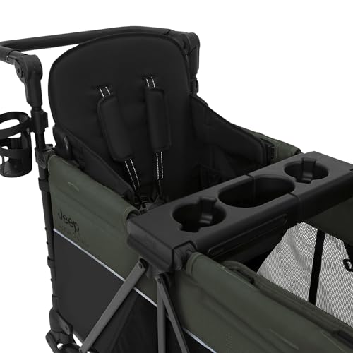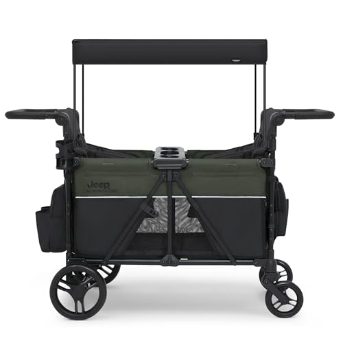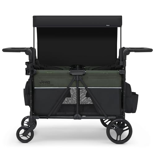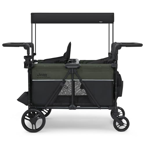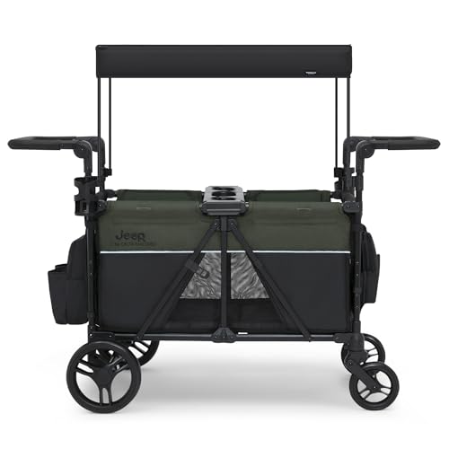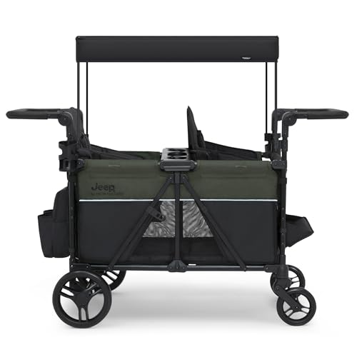 Jeep Aries Stroller Wagon by Delta Children – Premium Wagon for 2 Kids with Convertible Seats, Adjustable Push/Pull Handles, Removable Canopy & Flat Fold – Greenguard Gold Certified, Black/Green