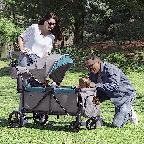 Be ready for adventure with the travel-ready Jeep Sport All-Terrain Stroller Wagon by Delta Children. Your all-in-one solution for smooth rides, tons of storage, and endless fun, this wagon is a comfy option for siblings or friends. This versatile stroller wagon features an adjustable canopy with an extendable sunshade to protect children from the elements. And, with two kids safely in tow, the adjustable leatherette handlebar with five different positions gives you the ability to push or pull on your next adventure. Equipped with tons of storage inside and out, each wagon comes with an expandable bag, tons of pockets, parent organizer, two parent cupholders and plastic child’s tray with compartments for snacks and drinks. Built to last, this wagon’s durable rust-resistant frame, puncture-proof tires and compact fold make it easy to stow or transport. More than a stroller wagon the Jeep Evolve Stroller Wagon by Delta Children makes it possible to create your own adventures with your family. Holds up to 110 lbs. (55 lbs. per seat). Weighs 33 lbs. Recommended for ages 9 months up to 55 lbs. Fits the following car seats (car seats and car seat adapter #A1961-001 sold separately): Graco SnugRide Click Connect 30, 35, 40 Evenflo Nurture Evenflo Embrace, Britax B-Safe 35, Chicco KeyFit 30.
