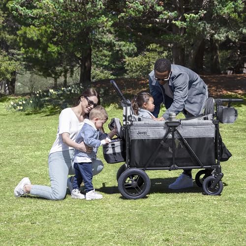 Jeep Wrangler Deluxe 4 Seater Stroller Wagon by Delta Children – Premium Quad Stroller Wagon for 4 Kids with Convertible Seats, Adjustable Push/Pull Handles, Removable Canopy & Flat Fold, Grey