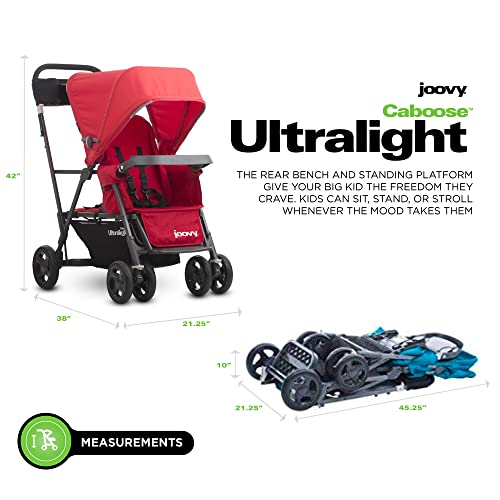 Joovy Caboose Ultralight Sit and Stand Double Stroller with Rear Bench and Standing Platform, 3-Way Reclining Seats, Optional Rear Seat, and Universal Car Seat Adapter (Red)