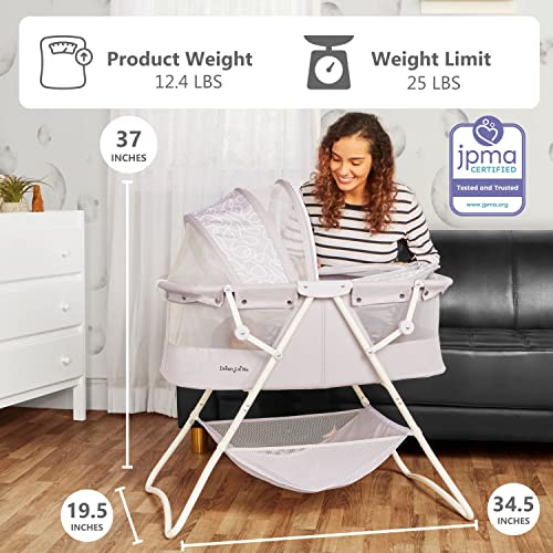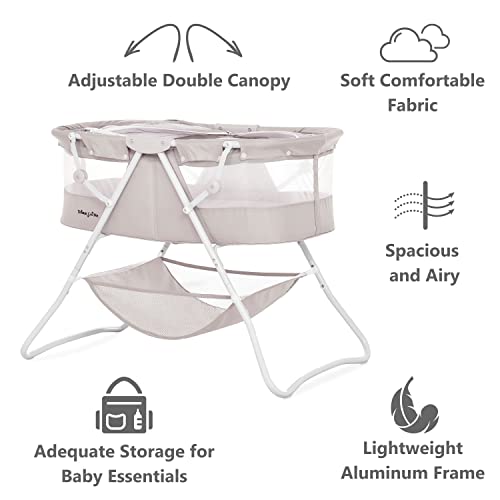 Karley Bassinet in Cool Grey, Lightweight Portable Baby Bassinet, Quick Fold and Easy to Carry , Adjustable Double Canopy, Indoor and Outdoor Bassinet with Large Storage Basket.