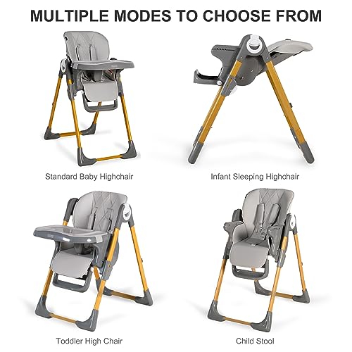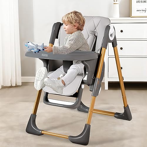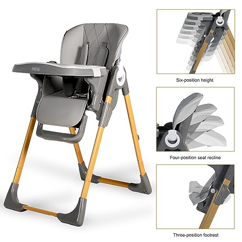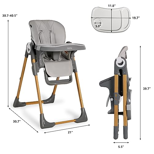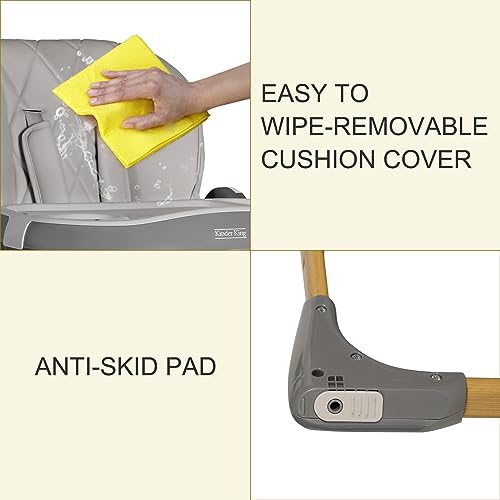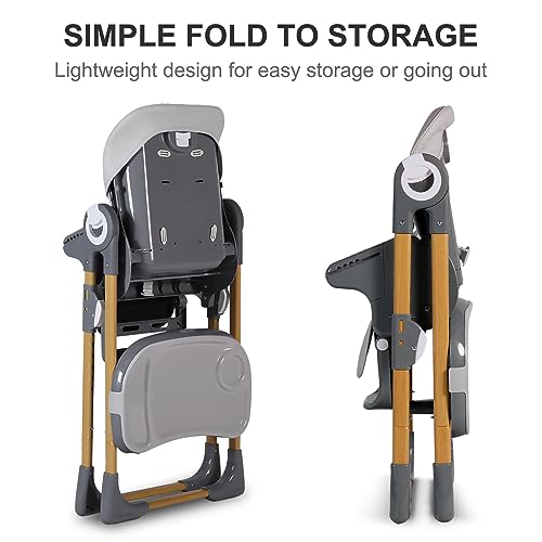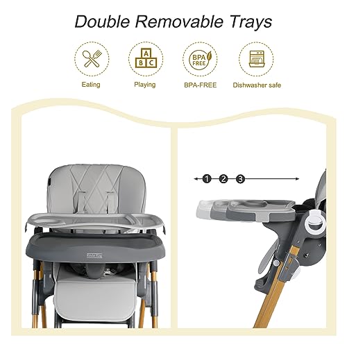 Kinder King High Chair for Babies & Toddlers, Converts to Toddler Chair, Simple Fold Highchair for Infants, Adjustable Height, Recline & Footrest, Detachable Double Trays, Easy to Wipe, Grey