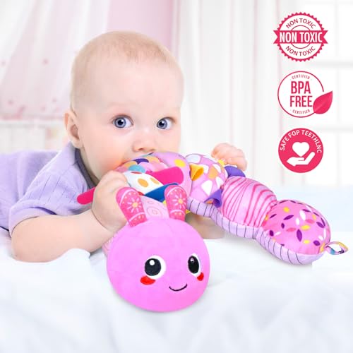 KMUYSL Infant Baby Musical Stuffed Animal Toys for 0-3-6-12 Months, Soft Sensory Toys with Crinkle and Rattles, Tummy Time Toys for Newborn Boys Girls, Caterpillar, Pink