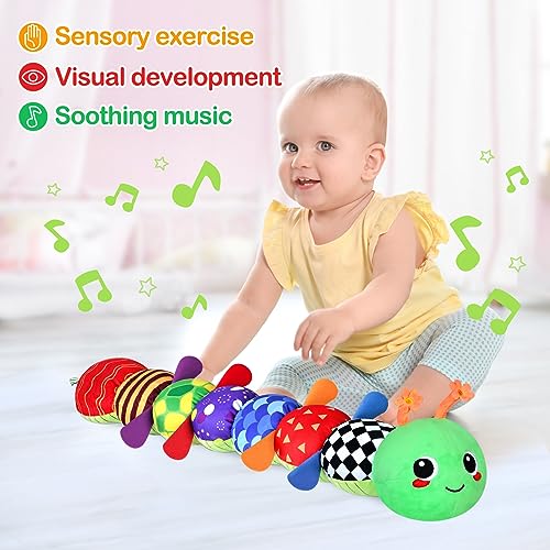 KMUYSL Infant Baby Musical Stuffed Animal Toys for 0-3-6-12 Months, Soft Sensory Toys with Crinkle and Rattles, Tummy Time Toys for Newborn Boys Girls, Caterpillar, Pink (Green)