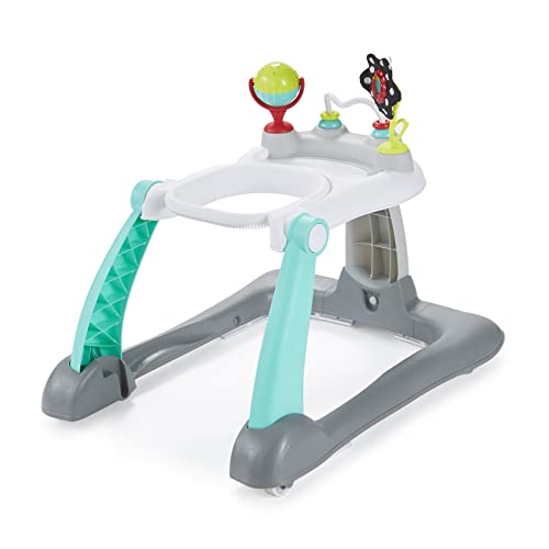 Your little one will be taking their first tiny steps with ease with our Tiny Steps 2-in-1 Activity Walker! The Tiny Steps 2-in-1 Baby Activity Walker with wheels converts from a seated walker to a walk behind walker as baby grows. The play tray provides toys for developmental activities and endless enjoyment from infancy through toddlerhood. Toys include upright flower mirror with crinkle petals and textured stem, spinning ball for batting play, bead bar for motor skill development, flower petal toy loops, and easy-clean tray with built-in cupholder. Independent front swivel wheels allows for easier maneuverability. Plush seat provides high back for comfort and support and is also height adjustable to grow with your baby – allowing them optimal feet placement. The Tiny Steps baby walker also folds flat for easy storage and travel while conveniently being easy to clean with its wipeable snack try and machine-washable seat pad. In the seated position, we recommend using this walker only if your child can support their body weight with their legs, weighs between 15 and 26 lbs., and is less than 32″ tall. Gender neutral walker for baby boy or walker for baby girl. Great for gift-giving, baby registry and baby showers. JPMA certified.