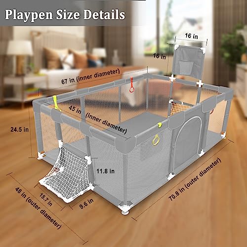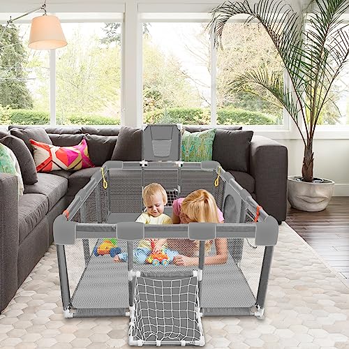 🏀【Designed with Basketball Hoop & Football Net】- The baby fence with basketball hoop and football Net,more fun and exercise than a normal baby fence.Babies are more willing to play, crawl and jump inside, and parents can take care of them directly outside or play together. What a fun baby playground!