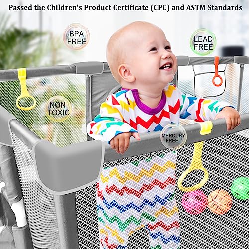 Large Baby Ball Pit Sturdy Play Pen/ Yard W/Basketball Hoop for Babies and Toddlers Children’s Fence Play Area, Indoor Outdoor Kids Activity Center, Infant Safety Gates (Grey)