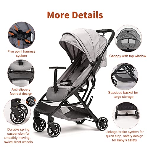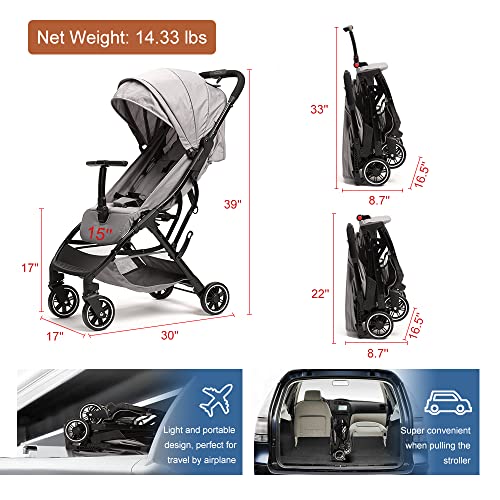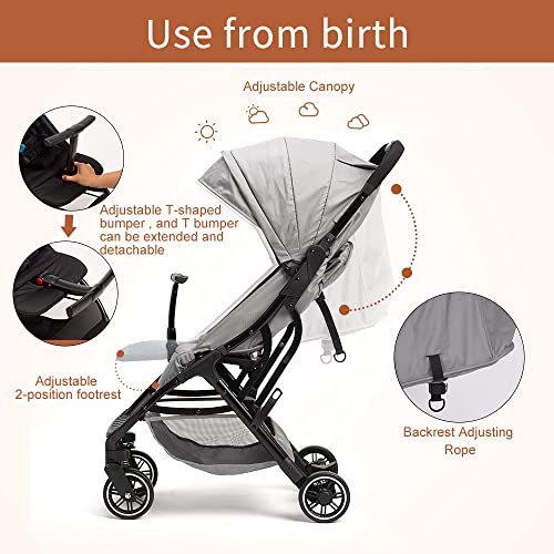 Lightweight Travel Stroller – Compact for Airplane, One-Hand Folding Baby Stroller, Toddler w/Adjustable Backrest/Footrest/T-Shaped Bumper(Gray)