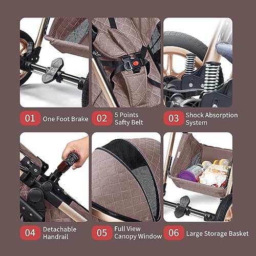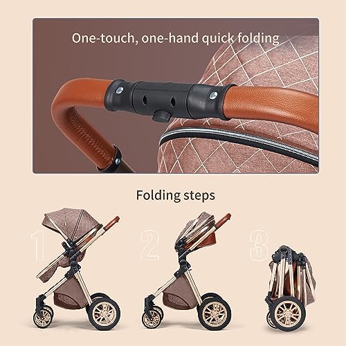Luxury Pram High Landscape Baby Stroller Folding Pushchair Vista Stroller with Reversible Stroller Seat (Brown)
