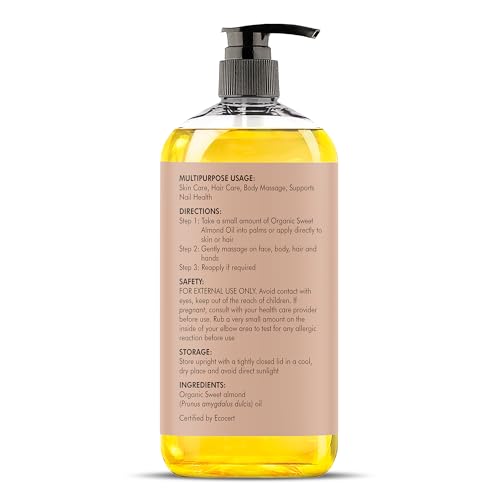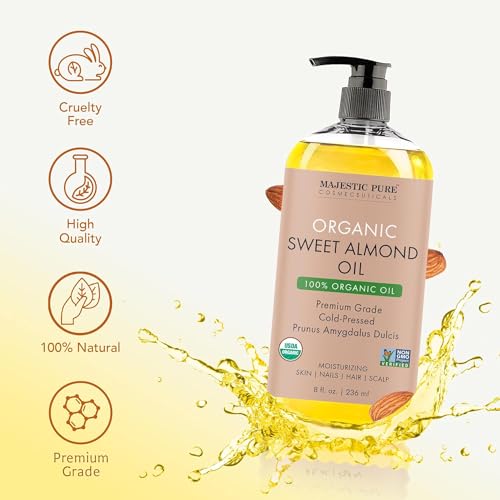 MAJESTIC PURE USDA Organic Sweet Almond Oil | 100% Pure & Natural Cold Pressed Oil Sweet Almond Oil for Skin, Face, Nails, Hair, Scalp & Massage | 8fl oz